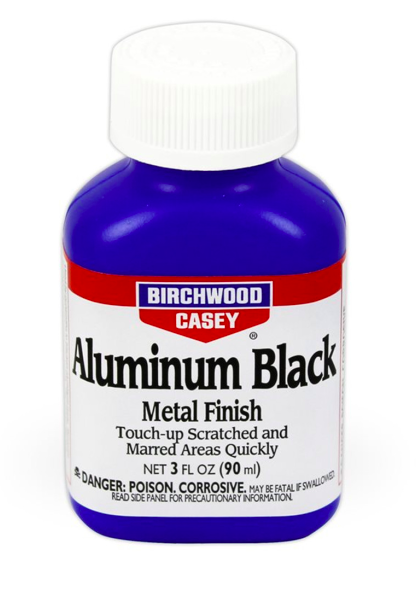 BIRCHWOOD CASEY ALUMINUM BLACK METAL FINISH BOTTLE The room temperature chemical used by gunsmiths and industry to blacken aluminum parts. Restores scratched and marred areas quickly. Fast-acting liquid is easy to apply with no dimensional change. Color will vary from deep gray to black depending on alloy. Aluminum black metal finish is also excellent for blackening name plates, plaques, trophies and other engraved items. Final appearance can be enhanced by applying a clear coat finish, wax or oil. KEY FEATURES: - Restores scratched and marred areas quickly; - Fast-acting liquid is easy to apply with no dimensional change; - Final appearance can be enhanced by applying a clear coat finish, wax or oil; BIRCHWOOD CASEY Since 1948, serious shooters, avid collectors and professional gunsmiths have relied on Birchwood Casey for shooting and gun care products; Birchwood Casey has pioneered innovative products with an unwavering dedication to quality