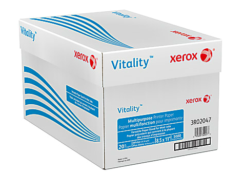 Designed for high-volume printing and copying, Xerox Vitality paper can help you complete daily tasks on time. ColorLok technology ensures rich, vibrant colors on every page, and this Xerox printer paper provides consistent performance to minimize jams and downtime. 20-lb paper is ideal for everyday projects. 92 brightness creates a crisp, professional look. ColorLok technology yields bold blacks and vivid colors with inkjet printers. Delivers 99.99% jam-free performance on most high-speed digital printing equipment. Compatible with most printers and copiers. Vitality multiuse printer paper with a 92 US brightness in a ream of 500 sheets comes in a case of 10 reams. FSC Certified printer paper is 20 lb and letter size (8-1/2in x 11in). Eco-conscious choice - has one or more meaningful eco-attributes or eco-labels. Forest Stewardship Council (FSC) certified - made from wood/paper that comes from forests managed to rigorous environmental and social standards, supported by the worlds leading conservation organizations. Leadership forestry - from forests or sourcing programs that meet specific environmental standards, helping you support practices that better protect forests and the environment., paper brightness (Euro): 104 , paper brightness (US): 92 , paper weight: 20 lb , printer compatibility: Inkjet Printer; Laser Printer; All-In-One , Product Line: Vitality Multipurpose Printer Paper , reams per case: 10 , Recommended Paper Use: General Purpose , sheet size: Letter (8-1/2" x 11"), sheets per ream/pack: 500 , Total Number Of Reams: 10 , total number of sheets: 5000 , acid free: Yes , bleaching chemistry: Elemental Chlorine Free (ECF) , brand name: Xerox , color: white , Colorlok Technology: Yes , Eco Label Standard: Forest Stewardship Council (FSC) Mixed , Eco-conscious: Leadership Forestry , Finish (Paper): Uncoated , manufacturer: XEROX CORPORATION , number of holes punched: 0